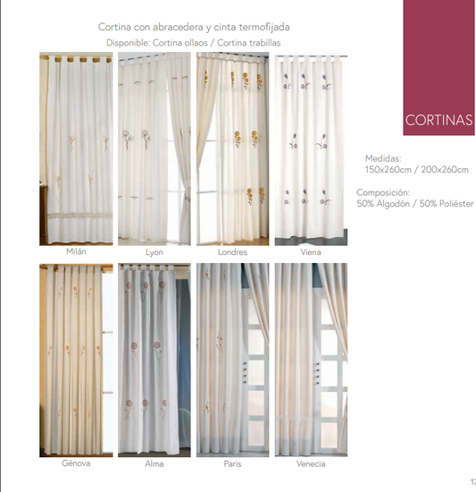 Cortinas de Loneta Bordadas Modelos: Milán, Lyon, Viena, Londres, Génova, Alma, Venecia, París.